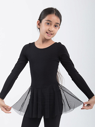Купальник с длинным рукавом и с юбкой из сетки в цвет основного полотна. Вырез горловины и проймы ножек окантованы бейкой из основного полотна.