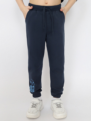 Брюки с притачным поясом и манжетами. Пояс из полотна с добавлением лайкры и эластичной резинкой внутри. Низ брюк с эластичной резинкой внутри. Передняя половинка брюк декорирована принтом "Продолжай катиться".