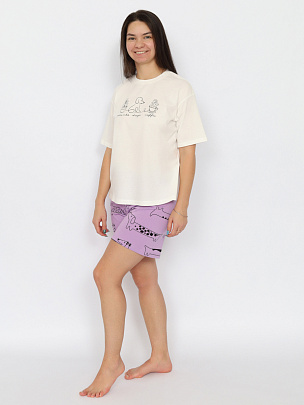 Пижама комбинированная из футболки и шорт. Футболка оверсайз с коротким рукавом выполнена из гладкокрашеного полотна. Горловина обработана притачной бейкой из рибаны с лайкрой. Перед оформлен принтом. Шорты свободного покроя длиной до середины бедра выполнены из набивного полотна дополнительного цвета. Цельнокроенный пояс обработан плоским швом вподгибку с одновременным прокладыванием резинки.