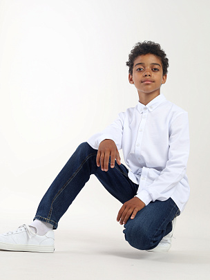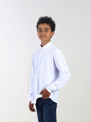 Рубашка полуприталенного силуэта, с длинным рукавом и притачными манжетами. Воротник обтачной с притачной стойкой и пуговицами. Застежка центральная на петли и пуговицы.