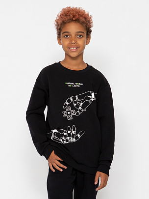 Джемпер с длинными рукавами, притачным поясом и манжетами. Рукав-реглан, отрезной, нижняя часть рукава декорирована принтом "Киберпространство".