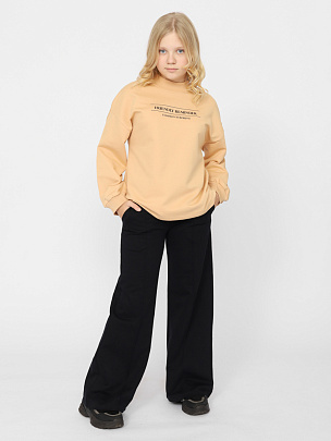 Джемпер для девочки с длинными рукавами и спущенными плечами. Горловина обработана воротником-стойкой из полотна с эластаном. Рукава с эластичными манжетами. Перед джемпера декорирован принтом.