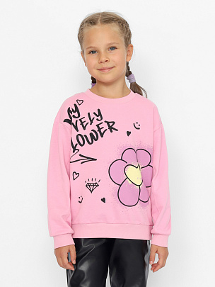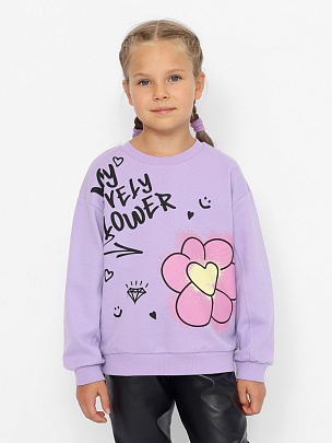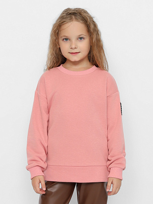 Трикотажный детский джемпер для девочек из набивного футера - имитирует костюмную ткань, с воротником-стойкой. Свитшот имеет спущенные рукава и свободный силуэт. Боковые швы переходят на перед. На рукавах и снизу толстовка отделана манжетами и поясом из основного полотна. Спереди декоративный металлический лейбл.