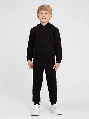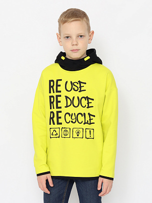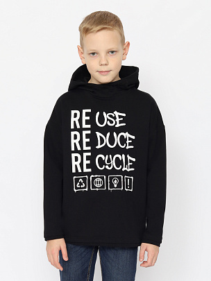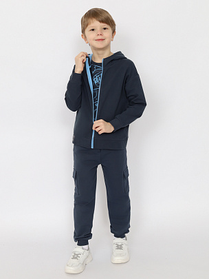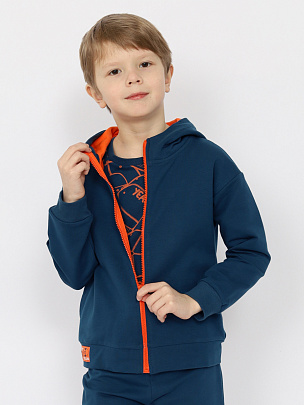 Толстовка для мальчика с капюшоном и карманами в боковых швах. Манжеты и пояс из эластичной рибаны. Внизу на полочке декоративная силиконовая нашивка.