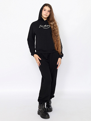 Толстовка для девушки с капюшоном и длинными рукавами из плотного трикотажа без начеса. Рукава с манжетами по низу. Притачной пояс и манжеты выполнены из полотна с эластаном. Перед толстовки декорирован принтом (я в порядке).