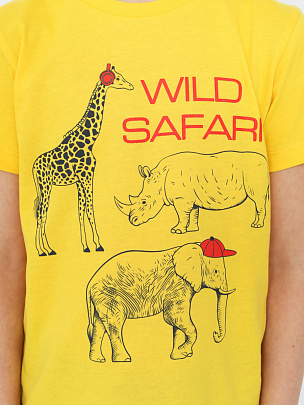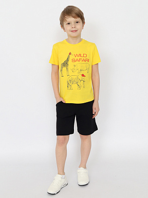 Футболка с коротким рукавом. Горловина круглая, обработана узким воротником из полотна с эластаном. Перед оформлен принтом.