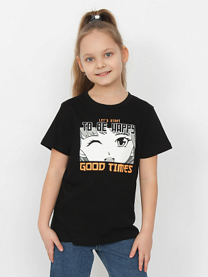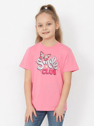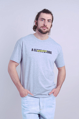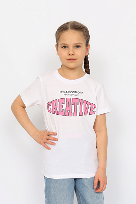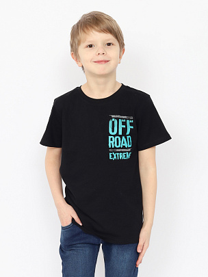 Футболка с коротким рукавом. Горловина круглая, обработана узким воротником из полотна с эластаном. Перед оформлен принтом с использованием краски с эффуктом "металлик".