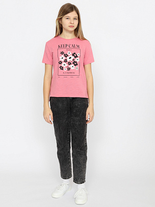 Футболка с коротким рукавом. Горловина круглая, обработана узким воротником из полотна с эластаном. Перед оформлен ярким принтом.