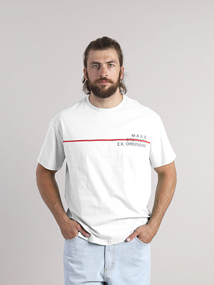 Футболка oversize со спущенным плечом, с коротким рукавом. Горловина круглая, обработана притачной бейкой из рибаны с лакрой. Плечевые швы смещены на перед и отстрочены. Перед оформлен принтом.